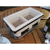 After looking for a replacement for my dead Hibachi I settled on the rectangular Yakatori Grill. It is not a Japanese Konro (Conro) barbecue, nor is it priced like one. It is made of diatomite/diatomaceous earth not ceramic, but it meets the challenge of grilling quite well. For the initial/test burn we set it in my firepit, the exterior got up to 150o F too hot for my table, but not too hot for the Habachi's metal cart. The grilling area over the coals went off the high end of my little laser thermometer just as any grill should.